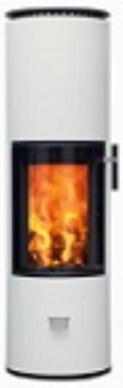 , rund, Stahl weiss. Inliegender Powerblock 80 kg, für lang anhaltende Wärmeabgabe. (mit ca. 8 kg Holz bis zu 10 Std. Wärmeabgabe). Verschliessbare Konvektionsluftöffnungen. Grosse Glasscheibe.Heizleistung: 6,0 kW