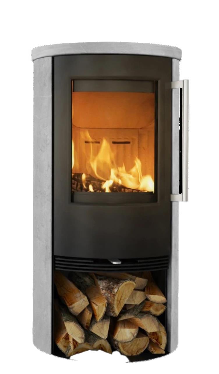 Eleganter, Kaminofen TT 21RS, Matt, Speckstein. Elliptische Form, Seiten und Topplatte Speckstein. Mit Magnetverschluss, Kaltgriff aus Edelstahl. Abgerundete Seiten und unterem Holzfach. Scheibenspülung und Aschelade.